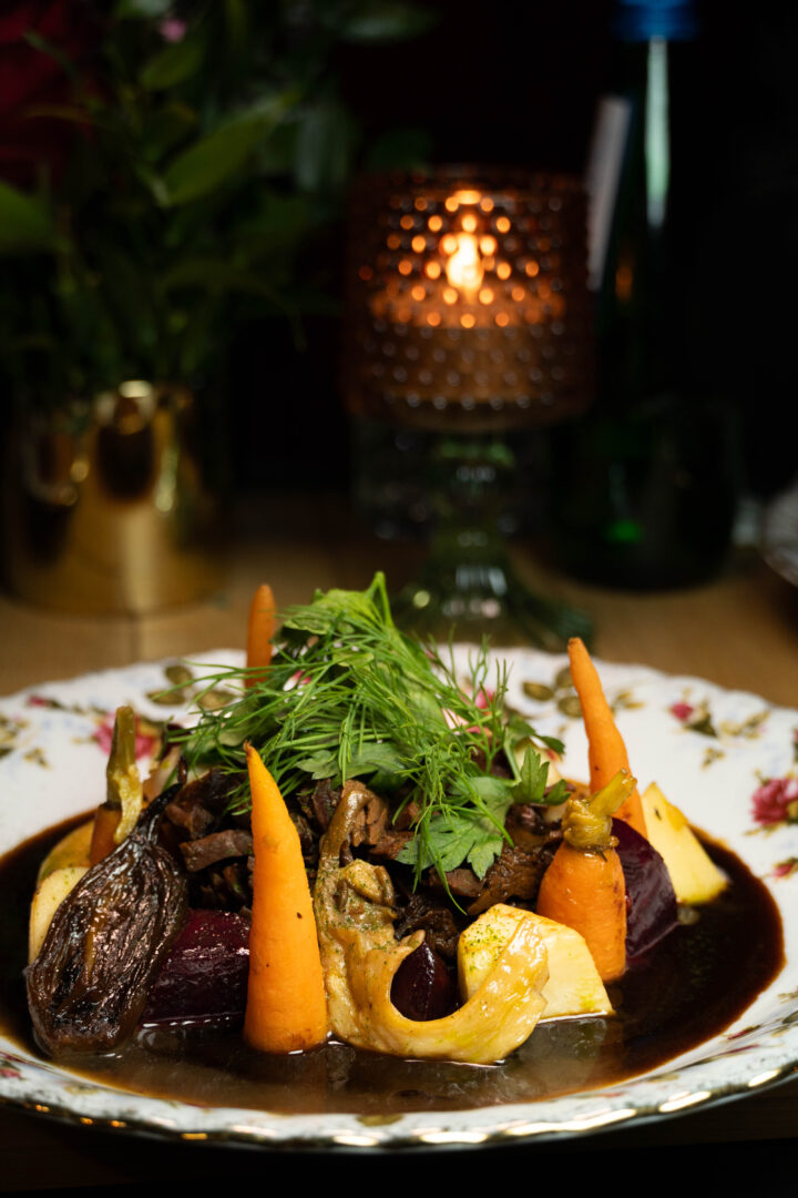 • Jeleń w zimowym lesie – długo duszony, szlachetny i głęboki w smaku, z purée ziemniaczanym i leśnym aromatem.