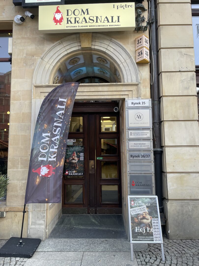 Dom Krasnali mieści się w samym centrum Wrocławia, przy Rynku 36/37 — tuż obok restauracji Bernard, więc uważajcie, żeby go nie przeoczyć. Już sama lokalizacja robi wrażenie: wchodzimy z wiecznie gwarnego Rynku i nagle… przenosimy się do zupełnie innego świata.