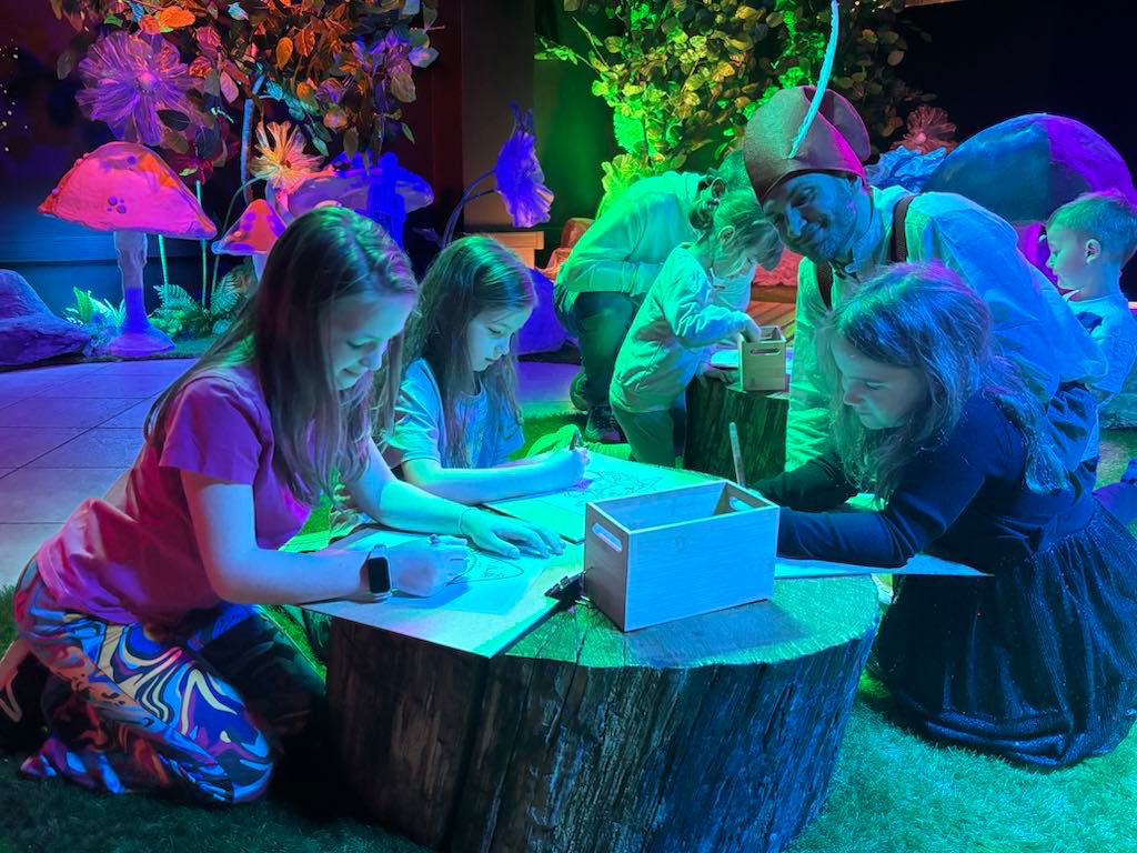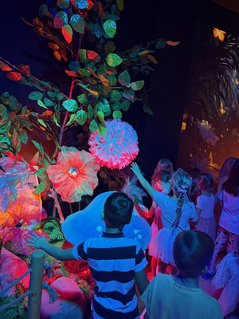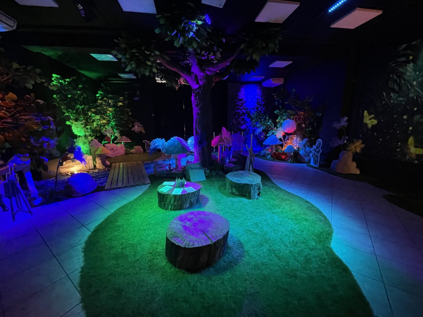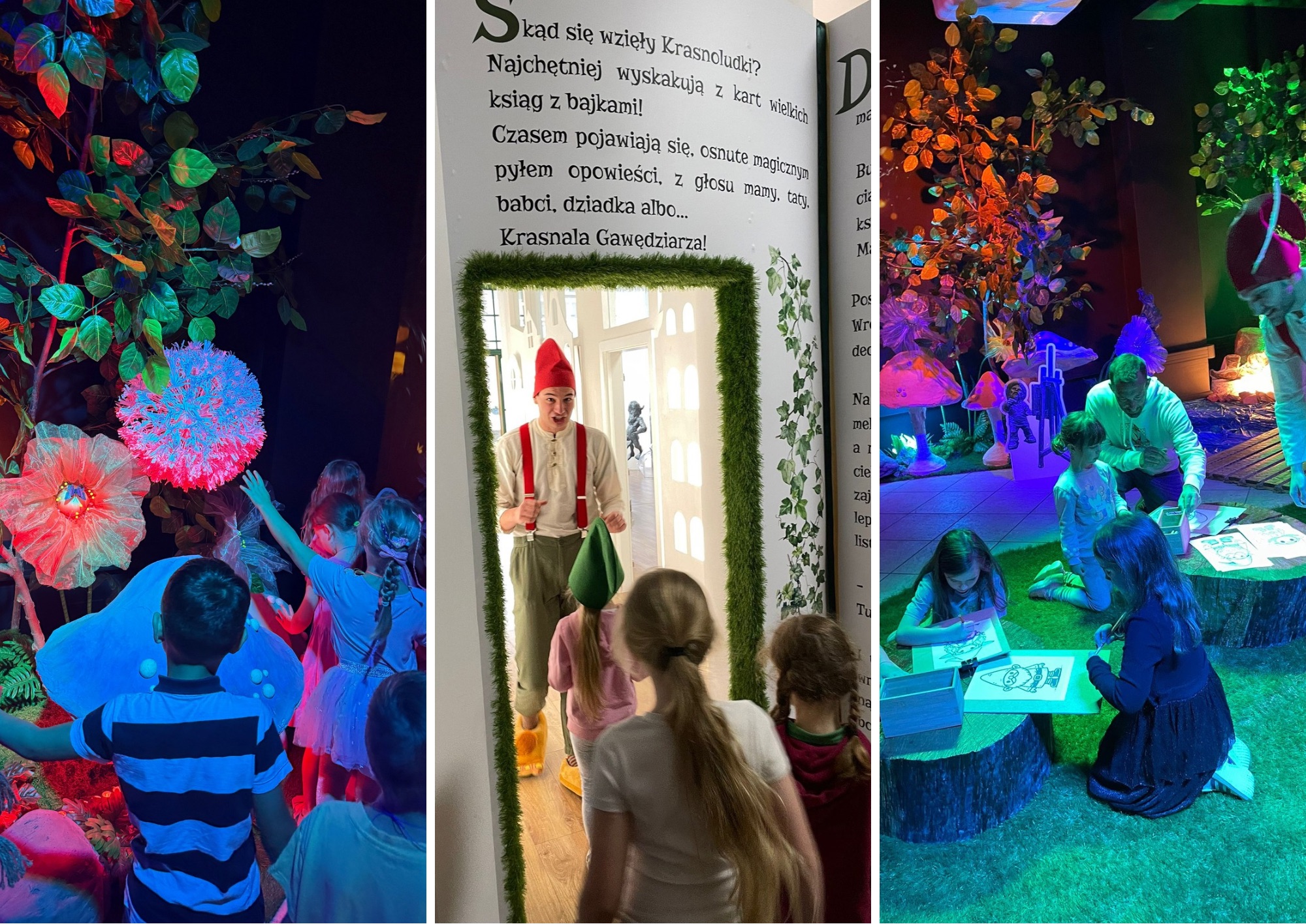 Wnętrze to starannie zaprojektowana, bajkowa kraina — Magiczny Las zamieszkany przez Krasnale. Scenografia jest naprawdę przemyślana: klimatyczne oświetlenie, detale na każdym kroku, dekoracje, które sprawiają, że oczy dziecka (i nie tylko!) robią się coraz większe z zachwytu.