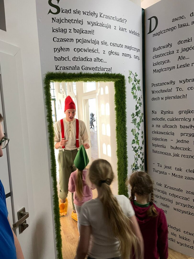 Zwiedzanie odbywa się wyłącznie z przewodnikiem — Krasnalem Gawędziarzem — i to właśnie ten element sprawia, że Dom Krasnali wyróżnia się spośród innych atrakcji. Nie chodzi tu o samodzielne chodzenie po wystawie. Gawędziarz prowadzi grupę przez kolejne pomieszczenia, opowiada historię krasnali wrocławskich, angażuje dzieci w interaktywne zabawy i gry.