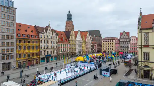 Konfetti czerwonych serduszek, lodowisko z widokiem na zabytkowe kamienice i Ratusz, mini skocznia narciarska, stoiska, warsztaty, animacje oraz konkursy z nagrodami – tak wyglądał finał zimowego sezonu w centrum Wrocławia. Rynek, który na co dzień tętni miejskim rytmem, podczas ferii zamienił się w lodową scenę i przestrzeń wspólnej zabawy dla całych rodzin.