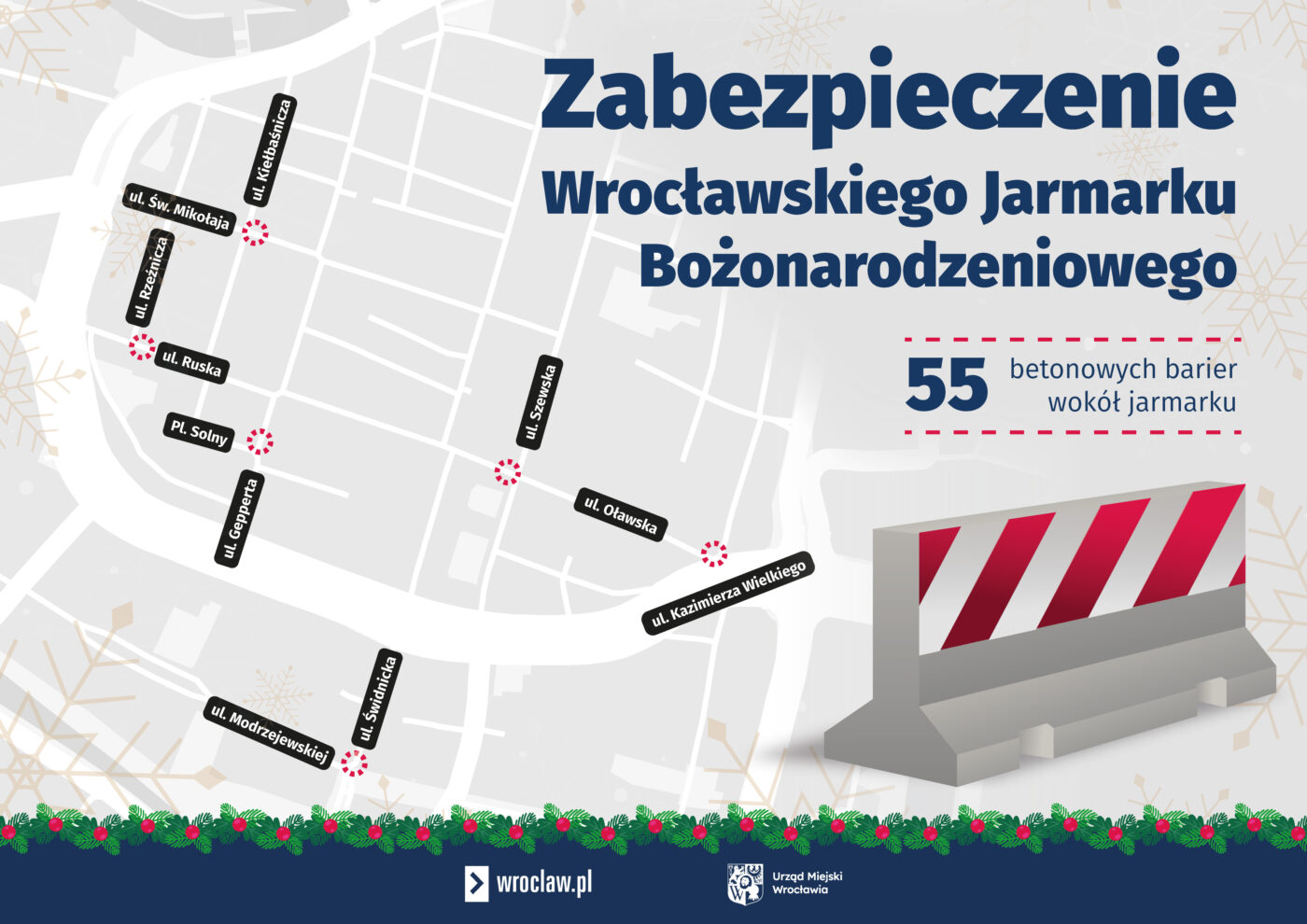 Teren Wrocławskiego Jarmarku Bożonarodzeniowego w Rynku zostanie zabezpieczony betonowymi barierami, by zwiększyć poczucie bezpieczeństwa spacerujących po jarmarku. Kilkadziesiąt betonowych elementów stanie równolegle do ruchu pieszych w sześciu lokalizacjach: