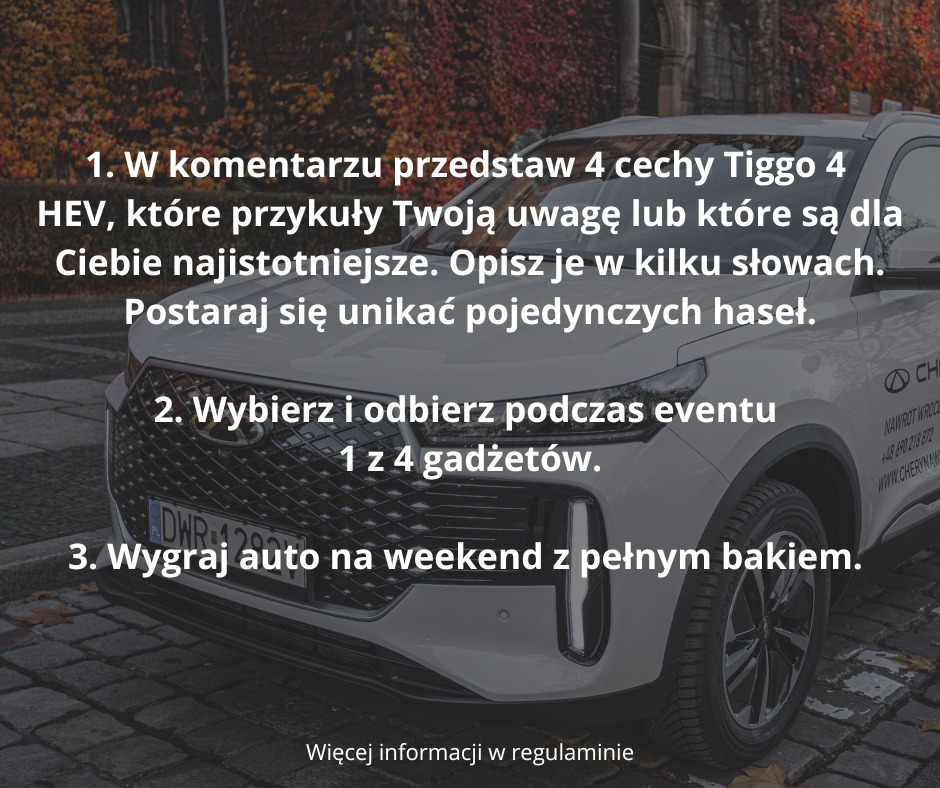 Dodatkowo, najciekawszy komentarz nagrodzimy weekendem z Chery Tiggo 4 HEV i pełnym bakiem paliwa. To wyjątkowa okazja, by poczuć komfort i moc Chery Super Hybrid na własnej skórze.